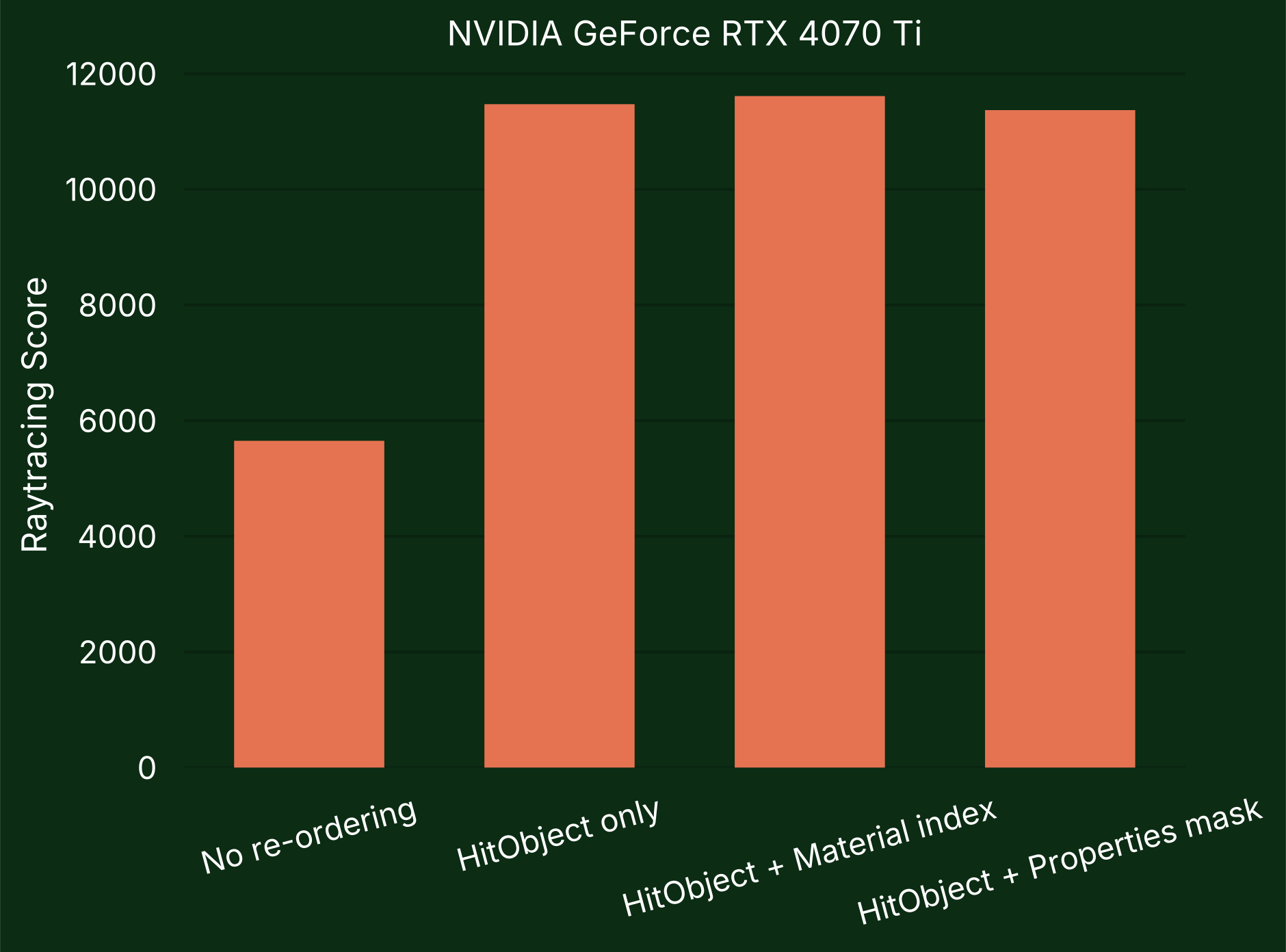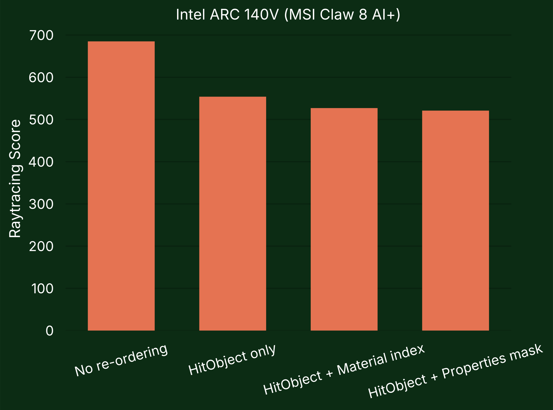 On Intel GPUs, Shader Execution Reordering does not currently provide a performance improvement. The ray tracing score was slightly worse than when not re-ordering when using the material index as a coherence hint, and lowest when the properties mask was used.